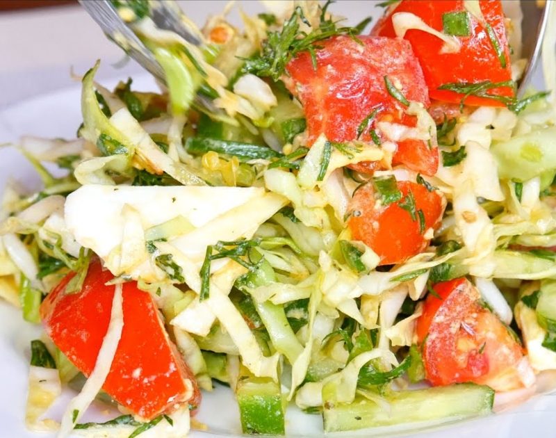 Կաղամբը կտրատել, ավելացնել միջին մեծությամբ կտրատած լոլիկ
