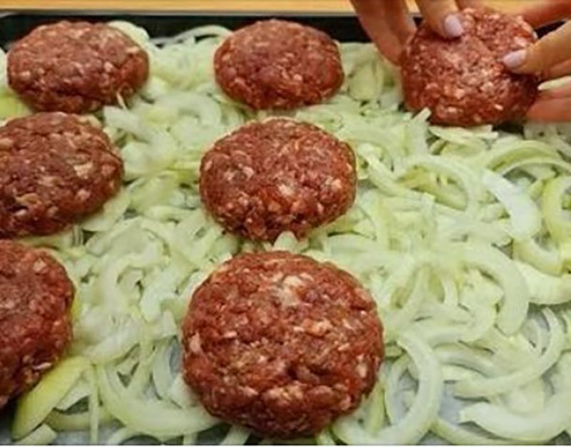 Մսից շրջանակներ պատրաստել և շարել սոխի վրա