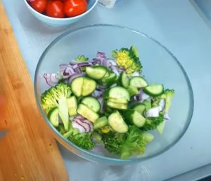 - Սոխը, վարունգը, պանիրը և լոլիկը կտրատել: