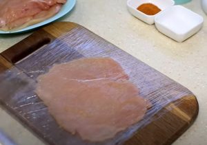 - Հավի կրծքամիսը երկայնքով բաժանել 2 մասի և «ծեծել»՝ սննդային տոպրակով ծածկելով: