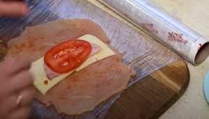 - Պանիրը, խոզապուխտը և լոլիկի շերտը դնել փափկամսի մեջ և ռուլետի պես փաթաթել: Միսը ամրացնել ատամի փայտիկներով, որպեսզի տապակելու ընթացքում չբացվի:
