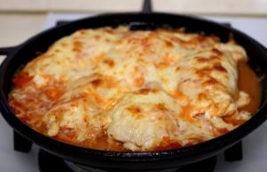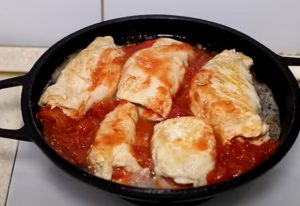 - 2 կողմից տապակելուց հետո զգուշությամբ հանել ատամի փայտիկները, և կտորների վրա լցնել լոլիկով զանգվածը: Այնուհետև ավելացնել աղ և շաքարավազ: