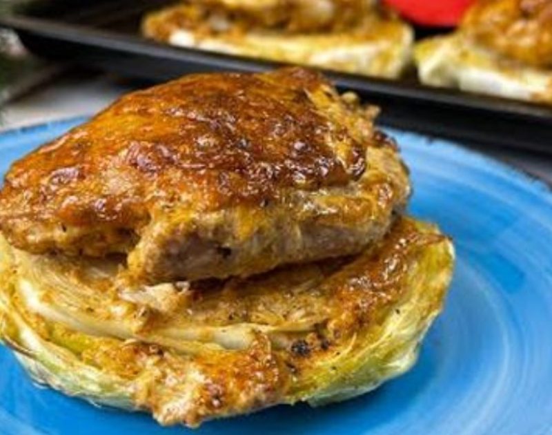Կաղամբը շրջանաձև կտրել (քանի կտոր միսն է, այնքան էլ պետք է լինի կաղամբը): Ջեռոցի թավայի մեջ ձեթ քսել և շարել կաղամբները