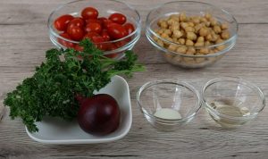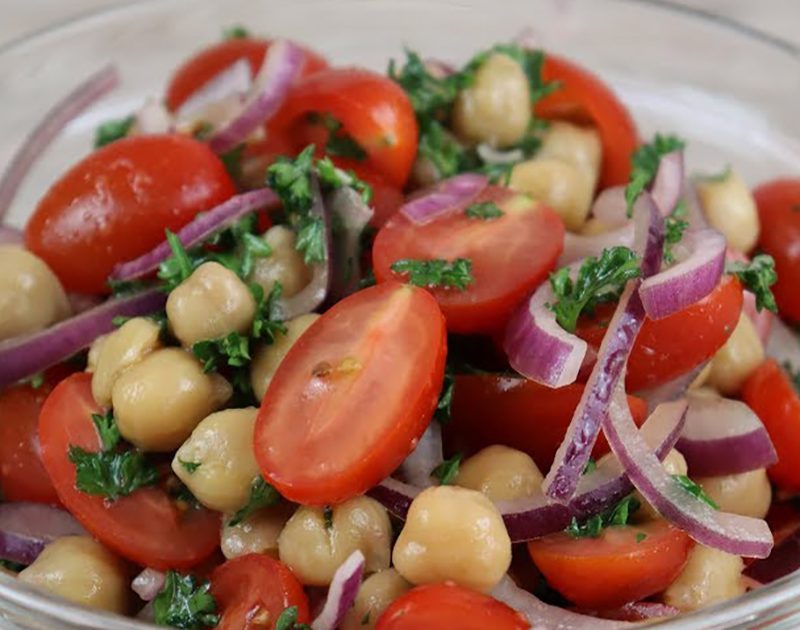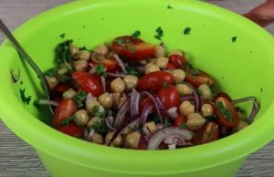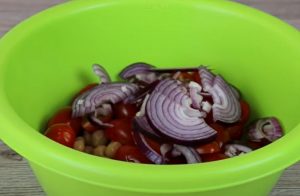 - Սոխը, մաղադանոսը, լոլիկը կտրատել և ավելացնել սիսեռի վրա: