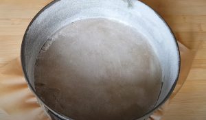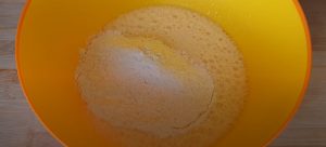 - Ալյուրը, օսլան, փխրեցուցիչը և աղը մաղել, լցնել խառնուրդի մեջ և հարել, մինչև որ դառնա համասեռ զանգված: