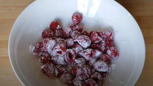 - Ազնվամորու վրա մի փոքր ալյուր կամ օսլա լցնել և զգուշությամբ խառնել: