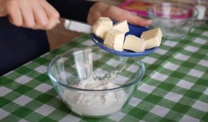 - Ալյուրի մեջ լցնել կտրատված կարագի կտորները, այնուհետև ձեռքով տրորել մինչև միասեռ զանգված ստացվի: