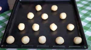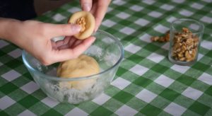 - Խմորից առանձնացնել փոքրիկ կտորներ, խմորի ներսում դնել ընկույզ, և ստանալ գնդիկներ: