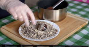 - Թխվածքաբլիթները թաթախում ենք շոկոլադե ջնարակի մեջ, այնուհետև` քերած վաֆլու թեփուկների մեջ: