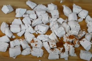 - Հավի կրծքամիսը խաշել, իսկ հետո կտրատել: Կտրատված կտորները համեմել կարմիր պղպեղով: