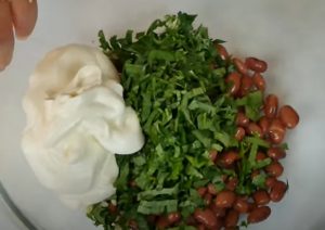 - Միավորել բոլոր բաղադրիչները, ավելացնել աղ և մայոնեզ և խառնել:
