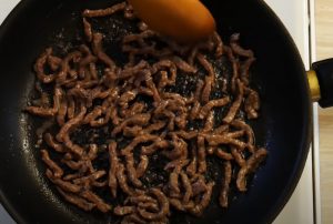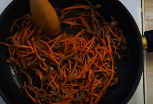 • Տավարի փափկամսի վրա ավելացնել մի փոքր ջուր, այնուհետև ավելացնել գազարը: Վրան լցնել 2 ճաշի գդալ սոյայի սոուս:
