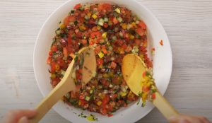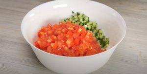 - Վարունգը և լոլիկը մանր խորանարդներով կտրատել: