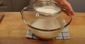 - Ալյուրին ավելացնել փխրեցուցիչը, դարչինը, խառնել, և քիչ-քիչ ացելացնել խմորին: