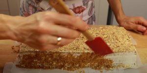 - Ընկույզը մանրացնել, և ցանել վերին շերտին: