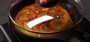 - Խնձորները շարել տարայի մեջ, վրան լցնել խմորը: