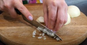 - Սոխը մանր կտրատել, վրան լցնել եռացրած ջուր: