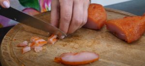 - Հավի ապխտած կրծքամիսը մանր կտրատել