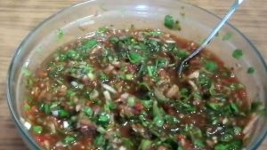 - Կանաչին խառնել խնձորին, սխտորը ճզմել, և ավելացնել կանաչիին: