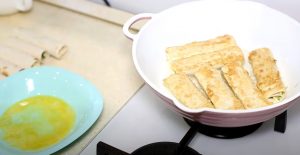 - Ստացված կտորները թաթախել աղով համեմված ձվի մեջ և տապակել: