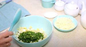 - Միջուկը պատրաստելու համար խաշված ձուն, կտրատված կանաչ սոխը, քերված պանիրը և 1 ճաշի գդալ մայոնեզը միասին խառնել:
