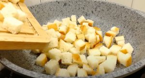 - Հացի կտորները խորանարդներով կտրատել, և տապակել շատ քիչ բուսայուղի մեջ: