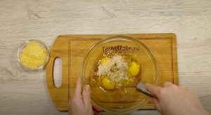 - Կարմրած հացիկներիը ավելացնել ձվի վրա, լավ խառնել , և եփել: