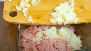 - Սոխը մանր կտրատել, սխտորը ճզմել կամ քերիչով անցկացնել: