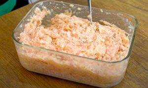 - Հավի աղացած մսի մեջ ավելացնել սոխը, սխտորը, սպիտակաձավարը, կաթը, 3 ճաշի գդալ կետչուպը, ձուն, ռեհանը, աղը, պղպեղը: