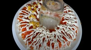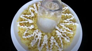 - Ափսեի մեջտեղում դնել բաժակ, շուրջը լցնել քերած կարտոֆիլը, վրան աղ ցանել, և լցնել մայոնեզը: