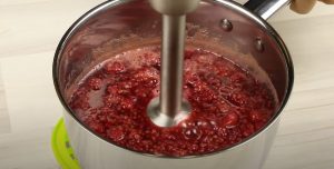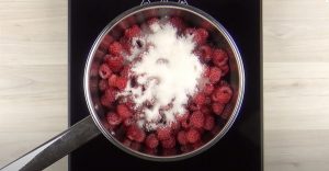 - Թավայի մեջ լցնել ազնվամորին, շաքարավազը, ավելացնել 100 մլ ջուր: Եռացնել 1–2 րոպե և հանել կրակի վրայից:
