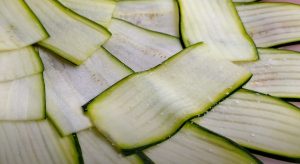 - Դդմիկը կամ ցուկինին բարակ շերտերով կտրատել: