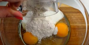 - Ձվին ավելացնել կեֆիրը, աղը և ալյուրը , և լավ խառնել: