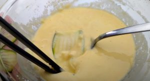 - Դդմիկների մանր շերտերը թաթախել ջնարակի մեջ, և տապակել բուսայուղի մեջ: