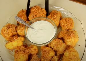 - Ծաղկակաղամբի կտորները թաթախել նախ ձվով զանգվածի, ապա պանրով զանգվածի մեջ: