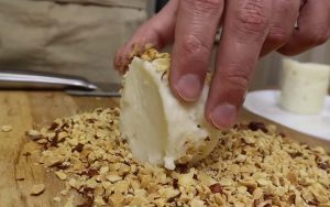 - Արդեն սառած միջուկը կտրատել նախընտրած չափսի, եզրերին ցանել գետնանուշը:
