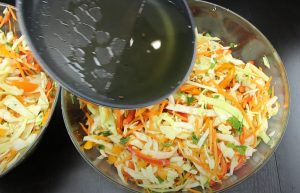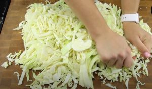 - Կաղամբը մանր կտրատել, ձեռքերով տրորել, որ փափկի: