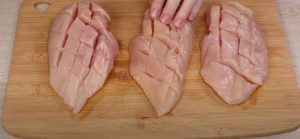 - Հավի կրծքամսի վրա դանակով ճեղքեր բացել: