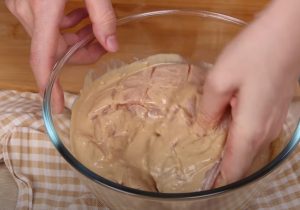 - Հավի կրծքամիսը դնել սոուսի մեջ, թողնել մնա 5 րոպե:
