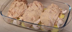 - Հավի կրծքամիսը դնել կարտոֆիլի և սունկի վրա: Ավելացած սոուսը լցնել վրան: