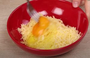 - Պանիրը քերիչով անցկացնել, ավելացնել ձուն, և միասին հարել: