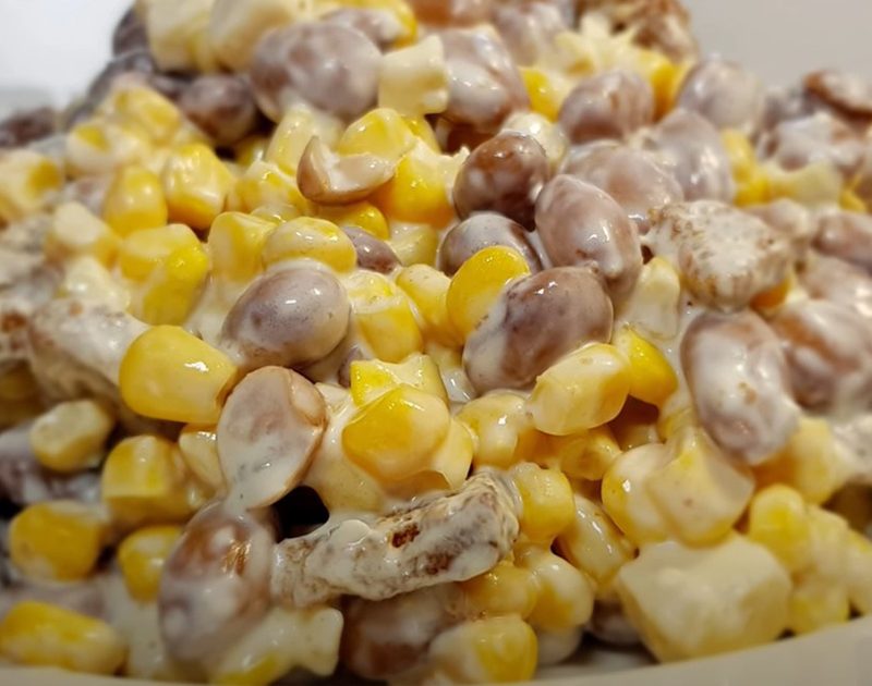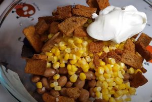 • Լոբին և պանիրը լցնել խորը ամանի մեջ, ավելացնել եգիպտացորենը: