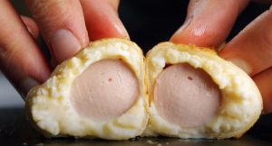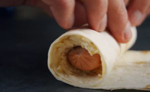 • Լավաշի ծայրին քսել միջուկը, նրբերշիկը դնել լավաշի մեջ, և ոլորել: