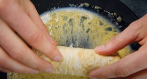 • Փաթաթված նրբերշիկները թաթախել թվի մեջ, և տապակել միջին կրակի վրա՝ ամեն կողմից 1-2 րոպե: