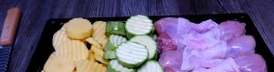 - Հավի բդիկները և կտրատված բանջարեղենը դասավորել տարայի մեջ: