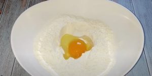 - Ալյուրին խառնել աղը, ավելացնել ձուն և ջուրը: Հունցել խմորը, փակել սննդային տոպրակով և թողնել 15 րոպե: