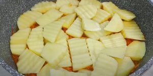 - Կարտոֆիլը կտրատել, քերիչով անցկացնել գազարը, սոխը մանրեցնել: