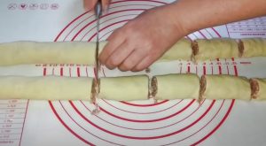 - Խմորի վրա ալյուր շաղ տալ, գրտնակել և բաժանել երկու մասի: Յուրաքանչյուր մասի վրա քսել աղացած միսը: