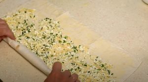 • Միջուկը պատրաստելու համար քերված պանիրը, կաթնաշոռը, կտրատված կանաչին, աղը և 1 հատ ձուն լավ խառնել: