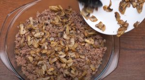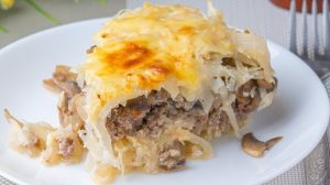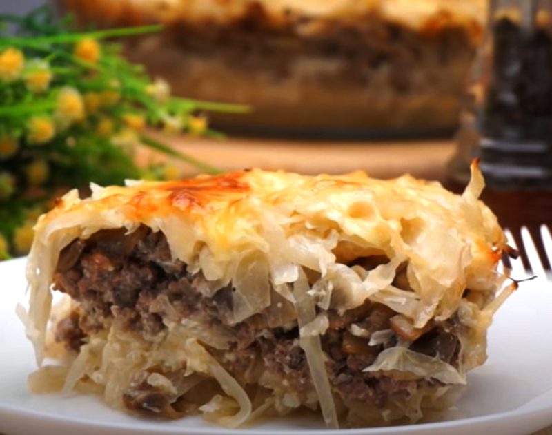 - Ձևամանի մեջ կարագ քսել, շերտ–շերտ լցնել տապակած կաղամբի կեսը, միսը, սունկը, այնուհետև կաղամբի մյուս մասը: Վրան լցնել թթվասերով զանգվածը: